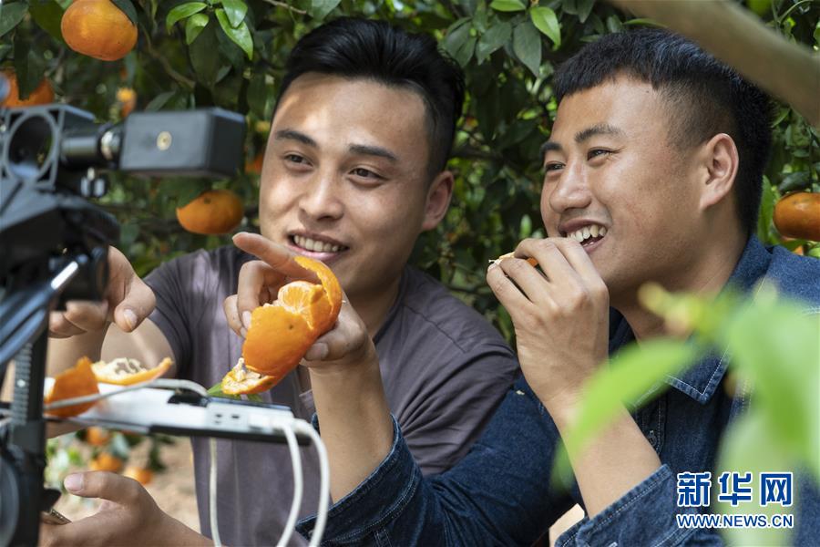 4月25日,肖欽仁(右)和朋友在成都金堂縣趙家鎮(zhèn)陽河街社區(qū)的一片果園做直播。 新華社記者 李夢馨 攝