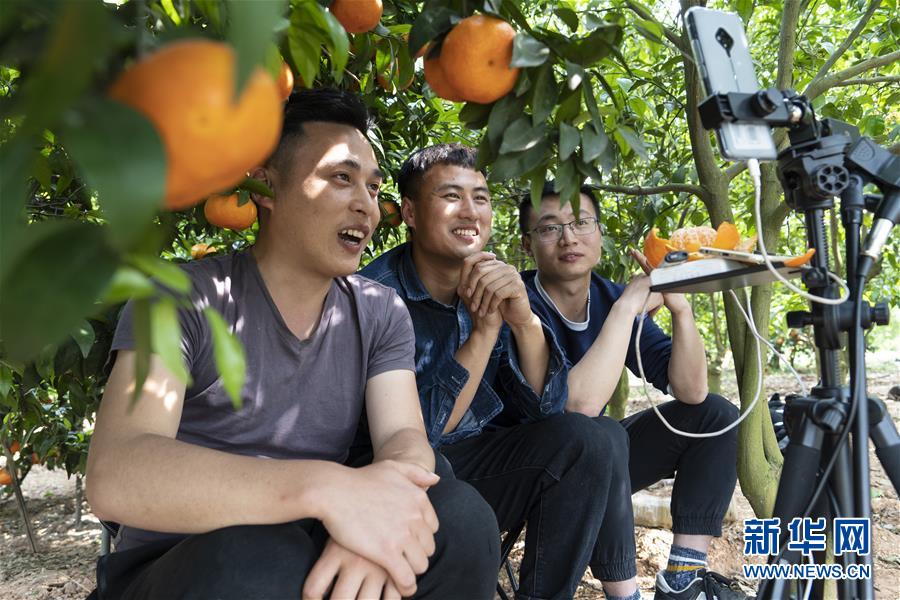 4月25日,肖欽仁(中)和朋友在成都金堂縣趙家鎮(zhèn)陽河街社區(qū)的一片果園做直播。 新華社記者 李夢馨 攝