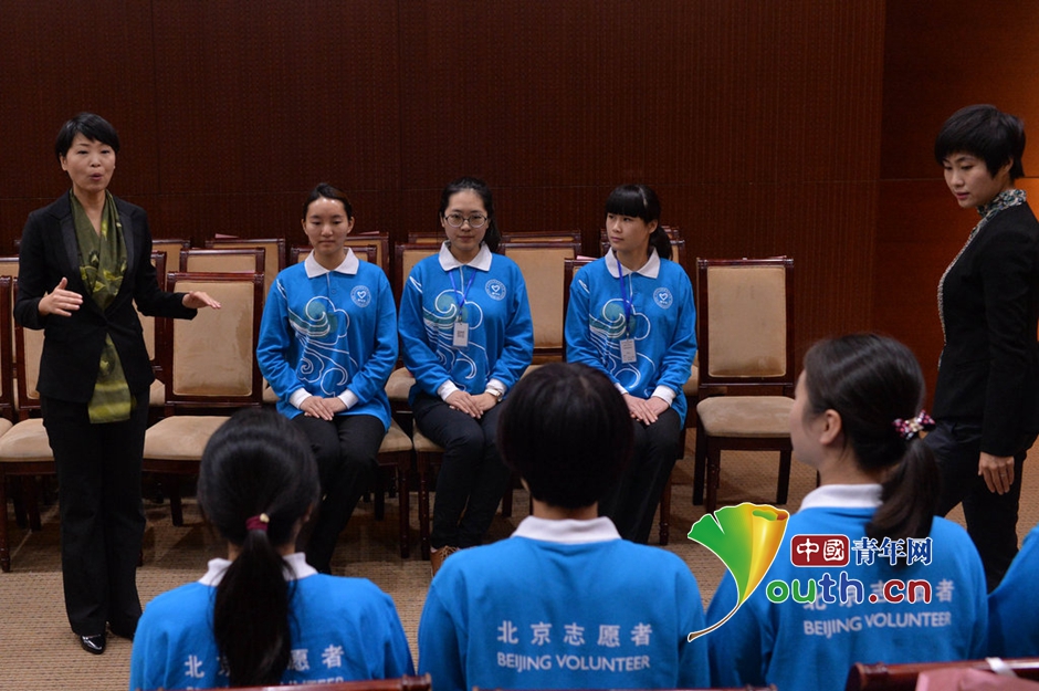 2014年10月24日,北京,志愿者在進(jìn)行形體和禮儀的相關(guān)培訓(xùn)。圖片作者:京華時(shí)報(bào) 王苡萱/CFP