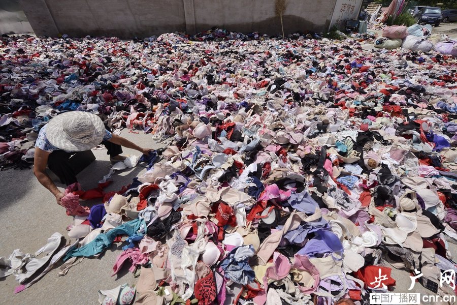 2014年8月6日,成壽寺地鐵站附近少角村,回收站工作人員在整理胸罩。近日,該回收站陸續(xù)回收了大量胸罩并當(dāng)街晾曬,引起路人好奇。圖片作者:新京報(bào)王嘉寧/CFP
