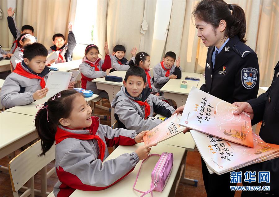 2月23日,上海市公安局徐匯分局徐家匯派出所民警黃雯怡(右一)向匯師小學(xué)學(xué)生發(fā)放公共安全教育教學(xué)補充讀本。當(dāng)日是上海中小學(xué)開學(xué)第一天,由上海市公安局和市教委在現(xiàn)有教材基礎(chǔ)上組織編撰的6冊全新的公共安全教育教學(xué)補充讀本被發(fā)放到中小學(xué)和幼兒園,供教師教學(xué)參考使用。新華社記者 凡軍 攝