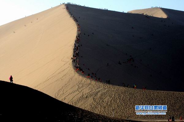 央廣網(wǎng)蘭州11月5日消息 甘肅鳴沙山月牙泉景區(qū)風光迷人,吸引了眾多中外游客。鳴沙山月牙泉位于甘肅省敦煌市城南5公里,沙泉共處,妙造天成,以“沙漠奇觀”著稱于世。新華社發(fā)(王將 攝)