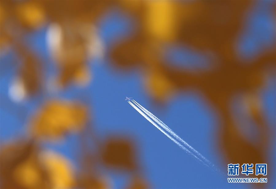 10月6日,一架飛機(jī)從甘肅省敦煌市莫高鎮(zhèn)的胡楊林上空飛過。新華社發(fā)(張曉亮 攝)
