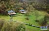 兩位游客漫步在云屏三峽自然風景區(qū)木屋營地的棧道上(10月18日無人機拍攝)。在秋意已濃的季節(jié),有著“天然氧吧”之稱的甘肅省隴南市兩當縣云屏三峽自然風景區(qū)層林盡染,景色絢麗,多彩秋景讓人仿佛置身童話世界。新華社記者陳斌 攝 -