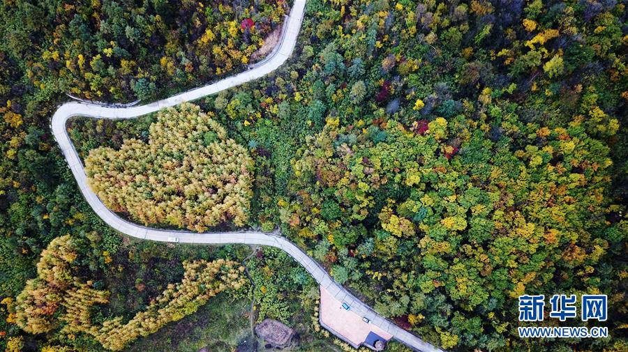 一輛汽車行駛在云屏三峽自然風景區(qū)的道路上(10月18日無人機拍攝)。在秋意已濃的季節(jié),有著“天然氧吧”之稱的甘肅省隴南市兩當縣云屏三峽自然風景區(qū)層林盡染,景色絢麗,多彩秋景讓人仿佛置身童話世界。新華社記者陳斌 攝