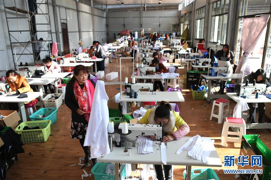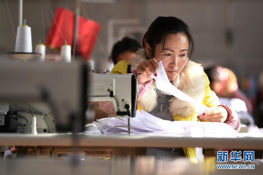 11月2日,渭源縣上灣鎮(zhèn)尖山村村民虎紅梅在上灣鎮(zhèn)“巾幗扶貧車間”內(nèi)加工服裝。新華社記者陳斌 攝 -