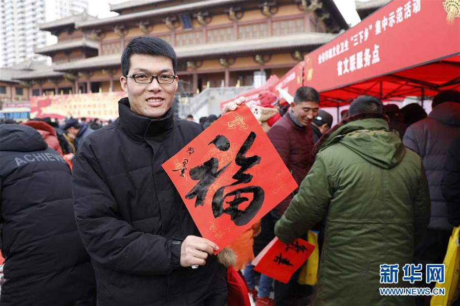 1月15日,在靜寧縣成紀(jì)廣場(chǎng),市民在展示福字。 當(dāng)日,甘肅省2019年文化科技衛(wèi)生“三下鄉(xiāng)”集中示范活動(dòng)在甘肅省靜寧縣舉行,文化、醫(yī)療和科技工作者為當(dāng)?shù)厝罕娝腿ベN心服務(wù)和新春祝福。 新華社發(fā)(張智敏 攝) -