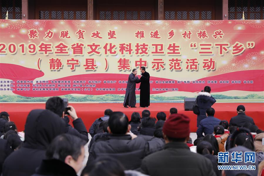 1月15日,在靜寧縣成紀(jì)廣場(chǎng),當(dāng)?shù)厝罕娫谟^看相聲表演《戲說(shuō)鄉(xiāng)音》。 當(dāng)日,甘肅省2019年文化科技衛(wèi)生“三下鄉(xiāng)”集中示范活動(dòng)在甘肅省靜寧縣舉行,文化、醫(yī)療和科技工作者為當(dāng)?shù)厝罕娝腿ベN心服務(wù)和新春祝福。 新華社發(fā)(張智敏 攝) -