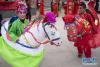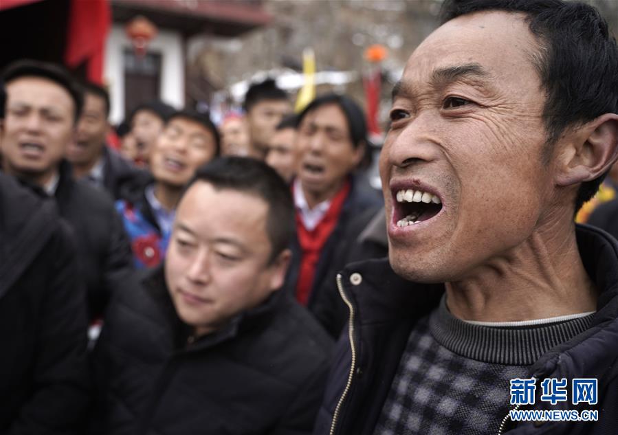 2月19日,在甘肅省隴南市武都區(qū)馬街鎮(zhèn)姜家山村,幾名男子在社火隊表演時大聲唱起當(dāng)?shù)氐母柚{。新華社記者才揚 攝