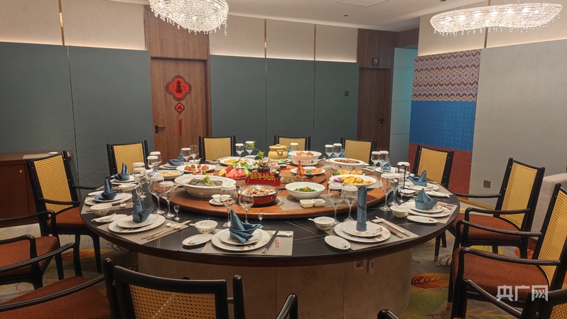 南寧飯店將壯鄉(xiāng)文化與文旅資源深度融合,打造“舌尖上的微文旅”。餐廳內(nèi),銅鼓紋飾的屏風(fēng)、繡球造型的吊燈相映成趣,非遺文創(chuàng)產(chǎn)品展示區(qū)吸引著食客駐足。“我們把山歌表演和‘高山流水’飲酒禮搬進(jìn)了餐廳,預(yù)訂年夜飯的顧客還有機(jī)會(huì)獲贈(zèng)德天瀑布、桂林山水等景區(qū)的門(mén)票優(yōu)惠。”南寧飯店餐飲部經(jīng)理覃麗培介紹,一頓團(tuán)圓飯,串聯(lián)起了“餐+游”的雙重體驗(yàn)。