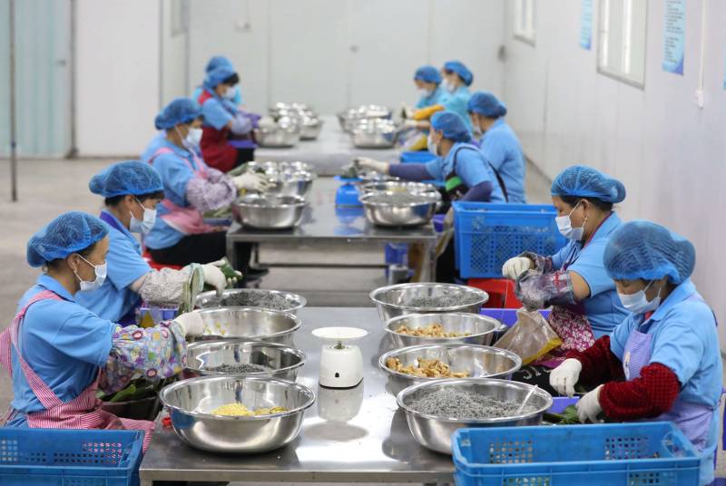工人們正在車間里包粽子。龔普康攝