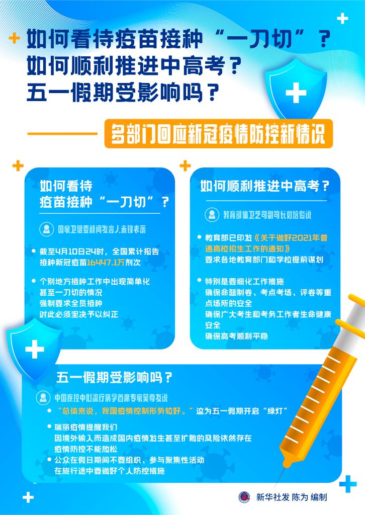 如何看待疫苗接種“一刀切”?如何順利推進(jìn)中高考?五一假期受影響嗎?多部門在11日集中回應(yīng)新冠疫情防控與疫苗接種新情況。