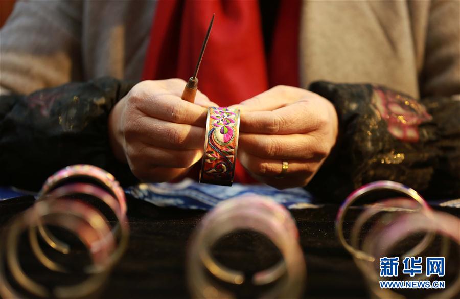 2月6日,在貴州省黎平縣一家手工銀飾店,侗族繡娘丁明煥組裝創(chuàng)意刺繡銀飾手鐲。近年來,貴州省黔東南苗族侗族自治州黎平縣大力發(fā)展文化創(chuàng)意產(chǎn)業(yè),鼓勵和扶持當(dāng)?shù)乩C娘、手工藝人把民族刺繡、銀飾等設(shè)計成為具有當(dāng)?shù)匚幕厣纳唐,帶動群眾致富增收。新華社發(fā)(楊代富 攝) -