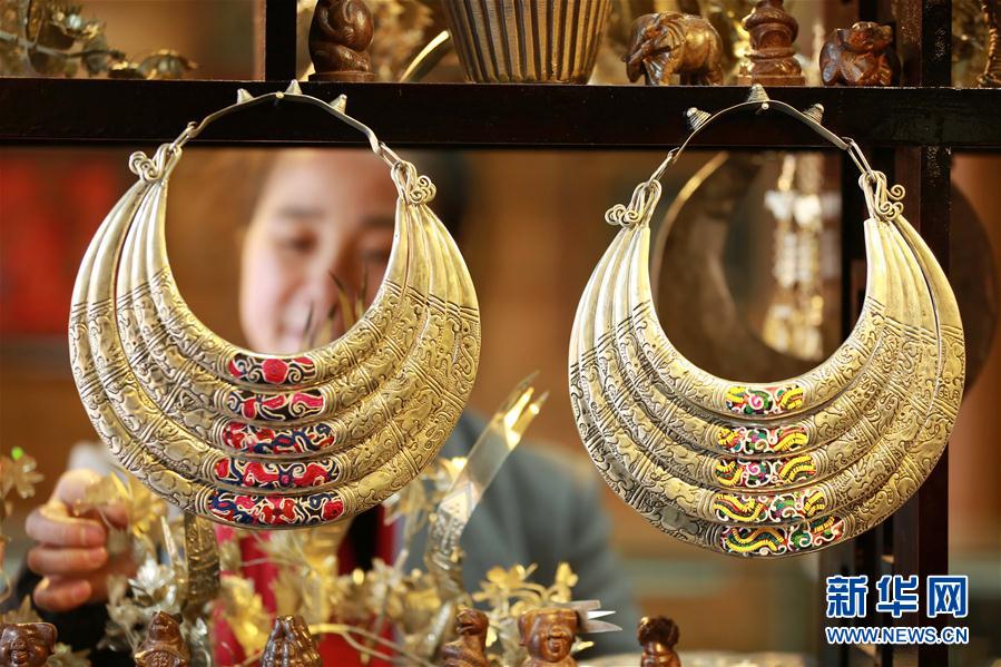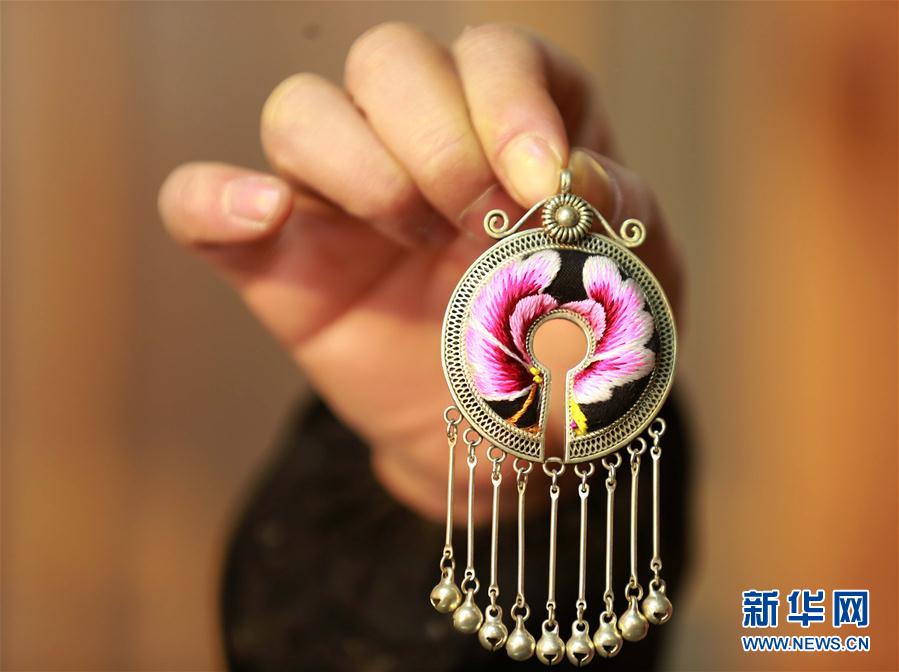 2月6日,在貴州省黎平縣一家手工銀飾店,侗族繡娘丁明煥展示創(chuàng)意刺繡銀飾耳環(huán)。近年來,貴州省黔東南苗族侗族自治州黎平縣大力發(fā)展文化創(chuàng)意產(chǎn)業(yè),鼓勵和扶持當(dāng)?shù)乩C娘、手工藝人把民族刺繡、銀飾等設(shè)計成為具有當(dāng)?shù)匚幕厣纳唐,帶動群眾致富增收。新華社發(fā)(楊代富 攝) -