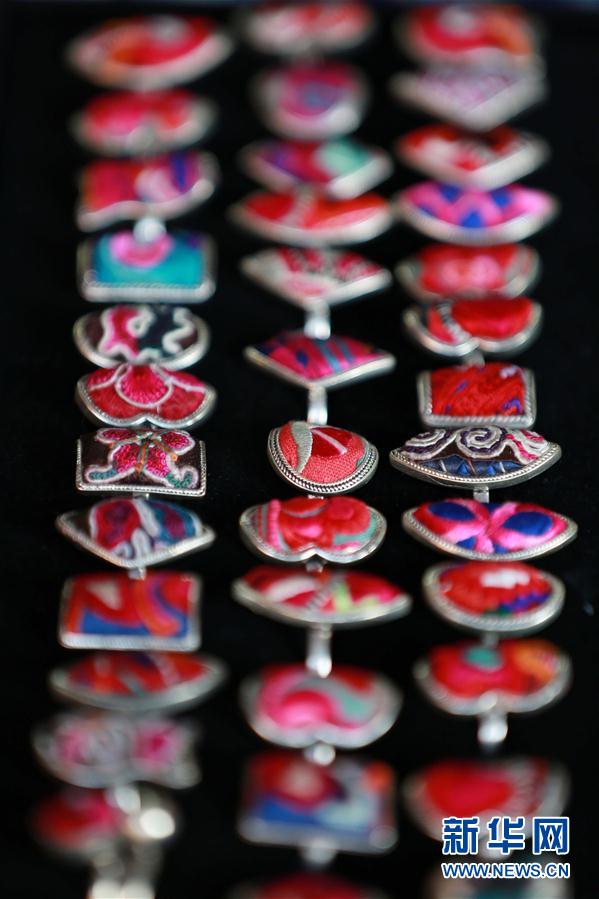 這是2月6日在貴州省黎平縣一家手工銀飾店拍攝的創(chuàng)意刺繡戒指。近年來,貴州省黔東南苗族侗族自治州黎平縣大力發(fā)展文化創(chuàng)意產(chǎn)業(yè),鼓勵和扶持當(dāng)?shù)乩C娘、手工藝人把民族刺繡、銀飾等設(shè)計成為具有當(dāng)?shù)匚幕厣纳唐,帶動群眾致富增收。新華社發(fā)(楊代富 攝)