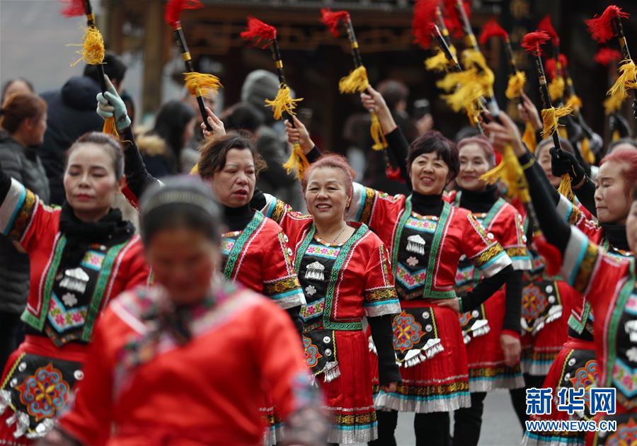 2月9日,金錢桿隊(duì)伍在玉屏街頭巡游展演。當(dāng)日是農(nóng)歷正月初五,貴州省銅仁市玉屏侗族自治縣舉行“民俗送祝!被顒(dòng);、山歌、金錢桿等隊(duì)伍輪番巡游,為現(xiàn)場(chǎng)觀眾獻(xiàn)上一場(chǎng)具有民族特色的民俗文化展示,增添了濃濃年味。新華社發(fā)(胡攀學(xué) 攝)