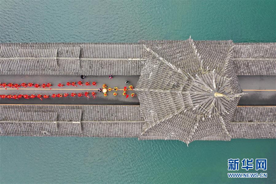2月9日,花燈隊(duì)伍在玉屏風(fēng)雨橋上巡游展演(無人機(jī)拍攝)。當(dāng)日是農(nóng)歷正月初五,貴州省銅仁市玉屏侗族自治縣舉行“民俗送祝!被顒(dòng);、山歌、金錢桿等隊(duì)伍輪番巡游,為現(xiàn)場(chǎng)觀眾獻(xiàn)上一場(chǎng)具有民族特色的民俗文化展示,增添了濃濃年味。新華社發(fā)(姚磊 攝)