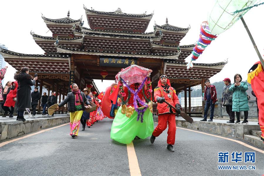 2月9日,花燈隊(duì)伍在玉屏風(fēng)雨橋上巡游展演。當(dāng)日是農(nóng)歷正月初五,貴州省銅仁市玉屏侗族自治縣舉行“民俗送祝!被顒(dòng);簟⑸礁、金錢桿等隊(duì)伍輪番巡游,為現(xiàn)場(chǎng)觀眾獻(xiàn)上一場(chǎng)具有民族特色的民俗文化展示,增添了濃濃年味。新華社發(fā)(胡攀學(xué) 攝)