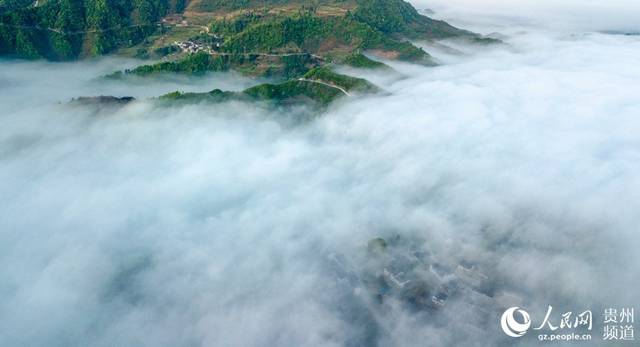 航拍貴州山村:霧繞仡鄉(xiāng)美如畫(高清組圖),4月17日,從空中俯瞰貴州省務(wù)川仡佬族苗族自治縣紅絲鄉(xiāng)先進(jìn)村,晨曦透過(guò)云霧,光輝灑滿村莊與青山,形成一幅夢(mèng)幻山村圖,宛若仙境。(田東)