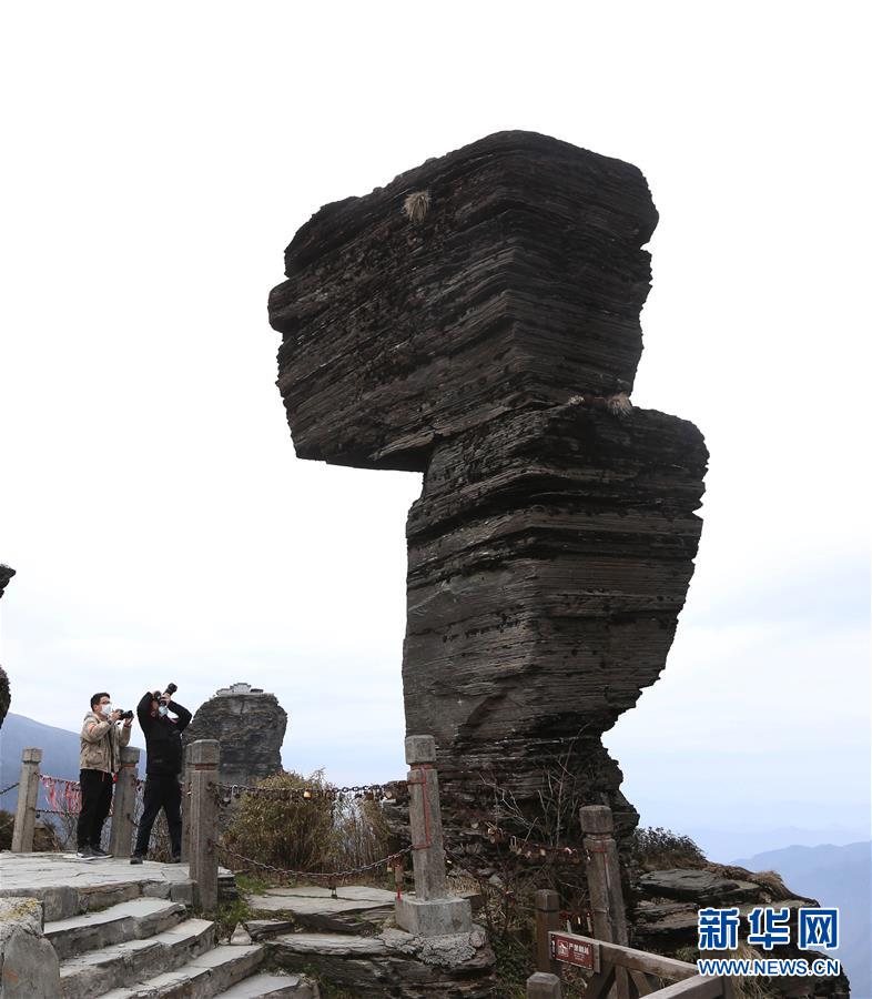 3月15日,游客在貴州省銅仁市梵凈山景區(qū)蘑菇石景點拍照。