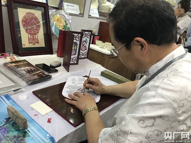 河北省蔚縣剪紙非遺傳承人焦新德先生現(xiàn)場制作蔚縣剪紙(央廣網(wǎng)發(fā) 閆金楓 攝)