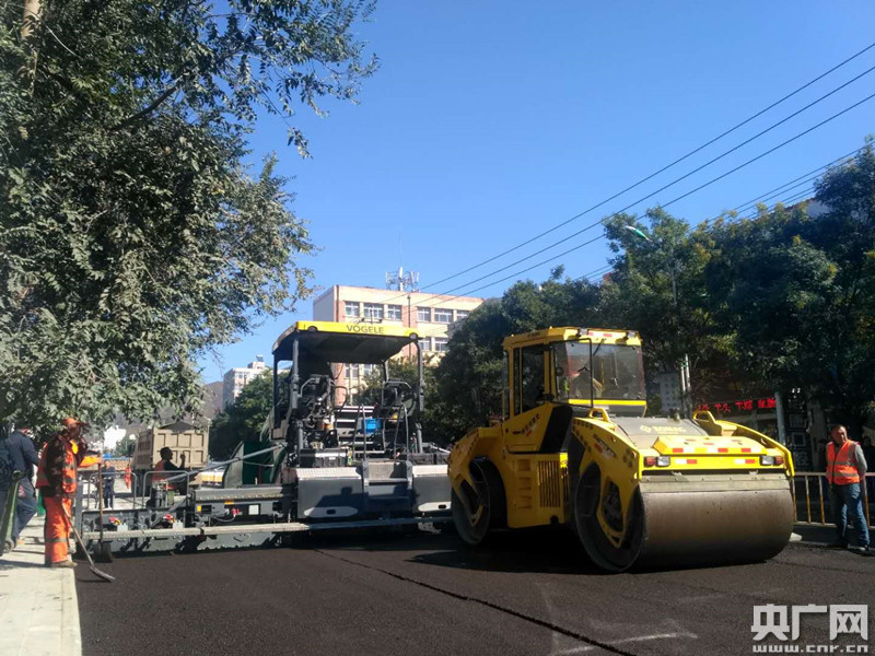 林園路道路改造現(xiàn)場,道路鋪裝使用再生瀝青。(央廣網(wǎng)發(fā) 張家口市橋東區(qū)委宣傳部供圖)