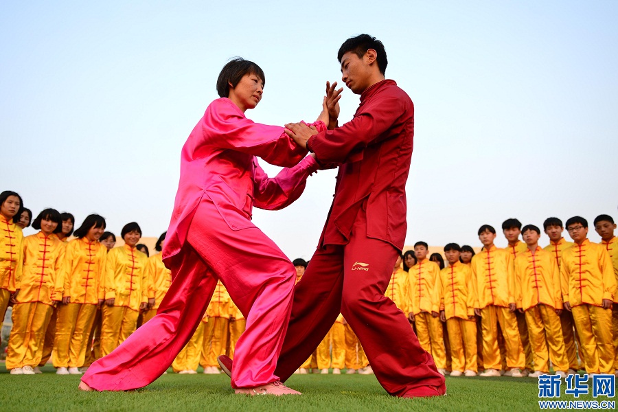 4月12日,河北省廣宗縣第一中學(xué)體育教師段寶利(左)和楊福春為學(xué)生示范太極拳推手。新華社發(fā) 陳雷攝