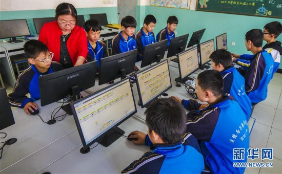 10月24日,河北省武強縣第二實驗中學(xué)的學(xué)生在老師的指導(dǎo)下學(xué)習(xí)機器人編程知識。 新華社記者 李曉果 攝
