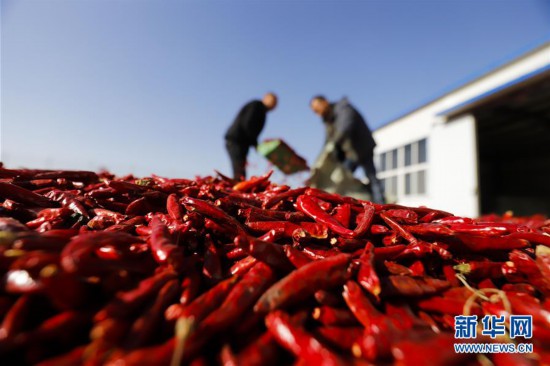 12月4日,河北省唐山市玉田縣亮甲店鎮(zhèn)黃林村農(nóng)民在場院晾曬辣椒。 當(dāng)日,河北省唐山市玉田縣亮甲店鎮(zhèn)黃林村農(nóng)民們利用晴好天氣,采摘、晾曬、包裝豐收的辣椒,場院里一片繁忙。 新華社發(fā)(劉滿倉 攝)