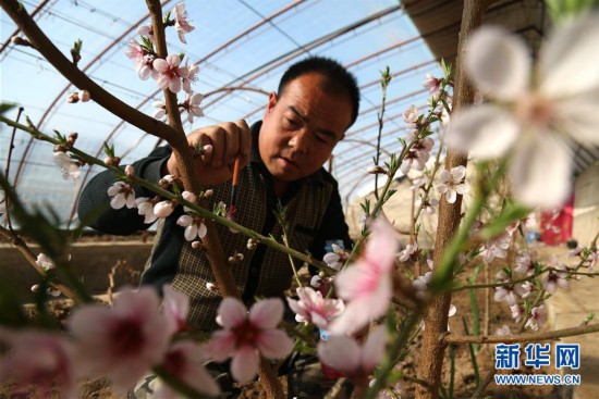 2月26日,甘肅酒泉敦煌市七里鎮(zhèn)秦家灣村農(nóng)民在溫室中為桃花授粉。 春日時節(jié),人們忙于生產(chǎn)勞動,為新一年的豐收和美好生活打下基礎(chǔ)。 新華社發(fā)(張曉亮 攝)