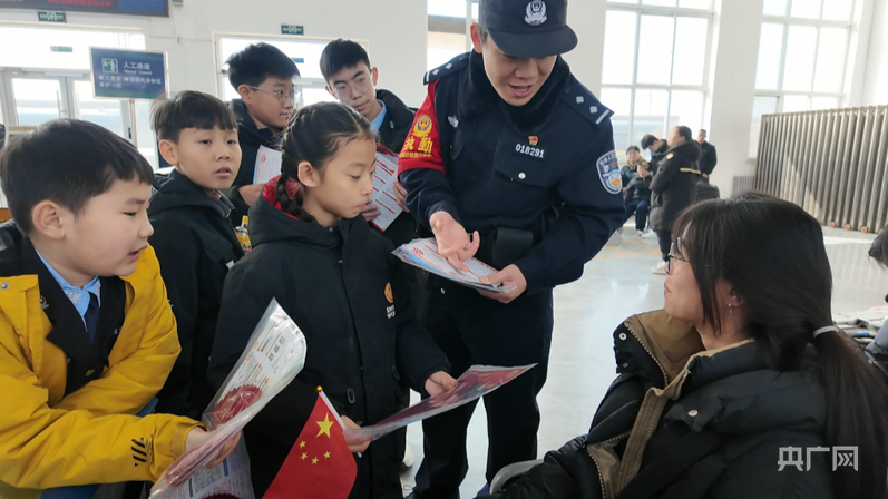 這是春運(yùn)首日北京鐵路公安局石家莊公安處辛集站派出所聯(lián)合衡水站派出所、衡水青少年普法協(xié)會共同開展的“攜手少年共宣傳 護(hù)航春運(yùn)平安路”主題宣傳活動現(xiàn)場。