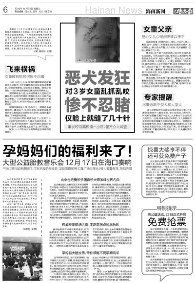 11月19日,在瓊海嘉積鎮(zhèn)前進街廉租房小區(qū)院內(nèi),3歲女童阿萌被一條阿拉斯加雪橇犬抓咬得面目全非。本報關(guān)于此事的引起讀者的廣泛關(guān)注。受害女童的父母表示,將追究狗主人的相關(guān)責任。部分瓊海市民希望政府有關(guān)部門盡快出臺養(yǎng)犬相關(guān)管理辦法,規(guī)范市民的養(yǎng)犬行為,避免類似悲劇重演。