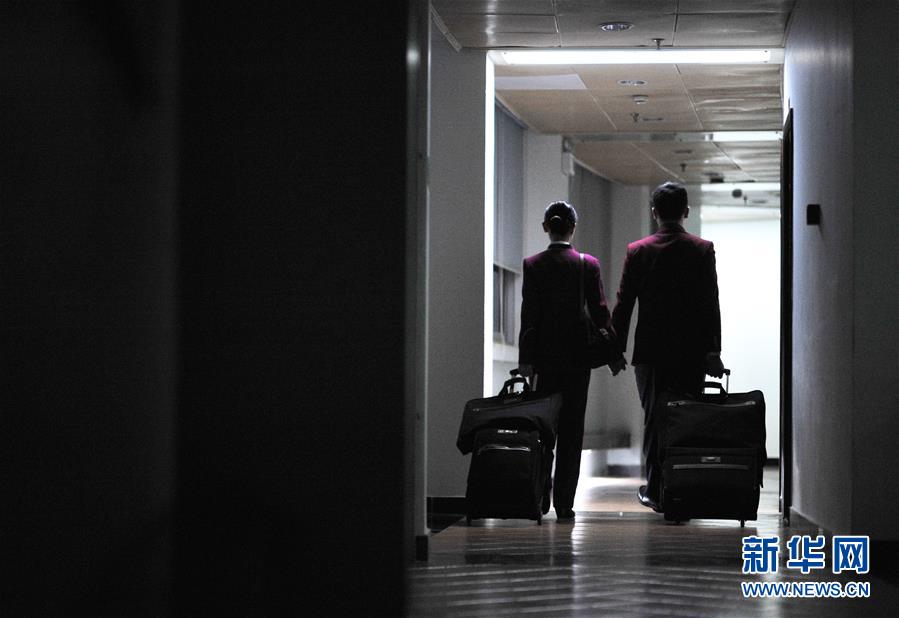 2月1日,在南航?诿捞m基地,寧儒(右)和梁鶴手牽手一起執(zhí)行航班任務。新華社發(fā)(楚洪雨 攝) -