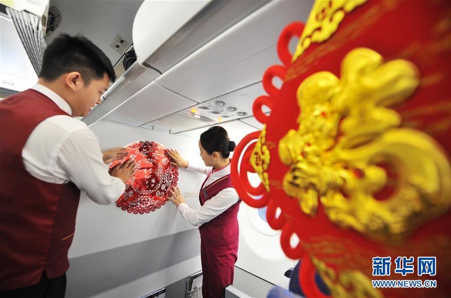 2月1日,寧儒(左)和梁鶴在旅客登機前裝飾客艙,讓旅客提前感受過年的喜慶氛圍。新華社發(fā)(楚洪雨 攝) -