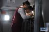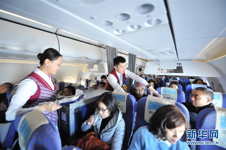 2月1日,寧儒和梁鶴在航班上為乘客服務。新華社發(fā)(楚洪雨 攝) -