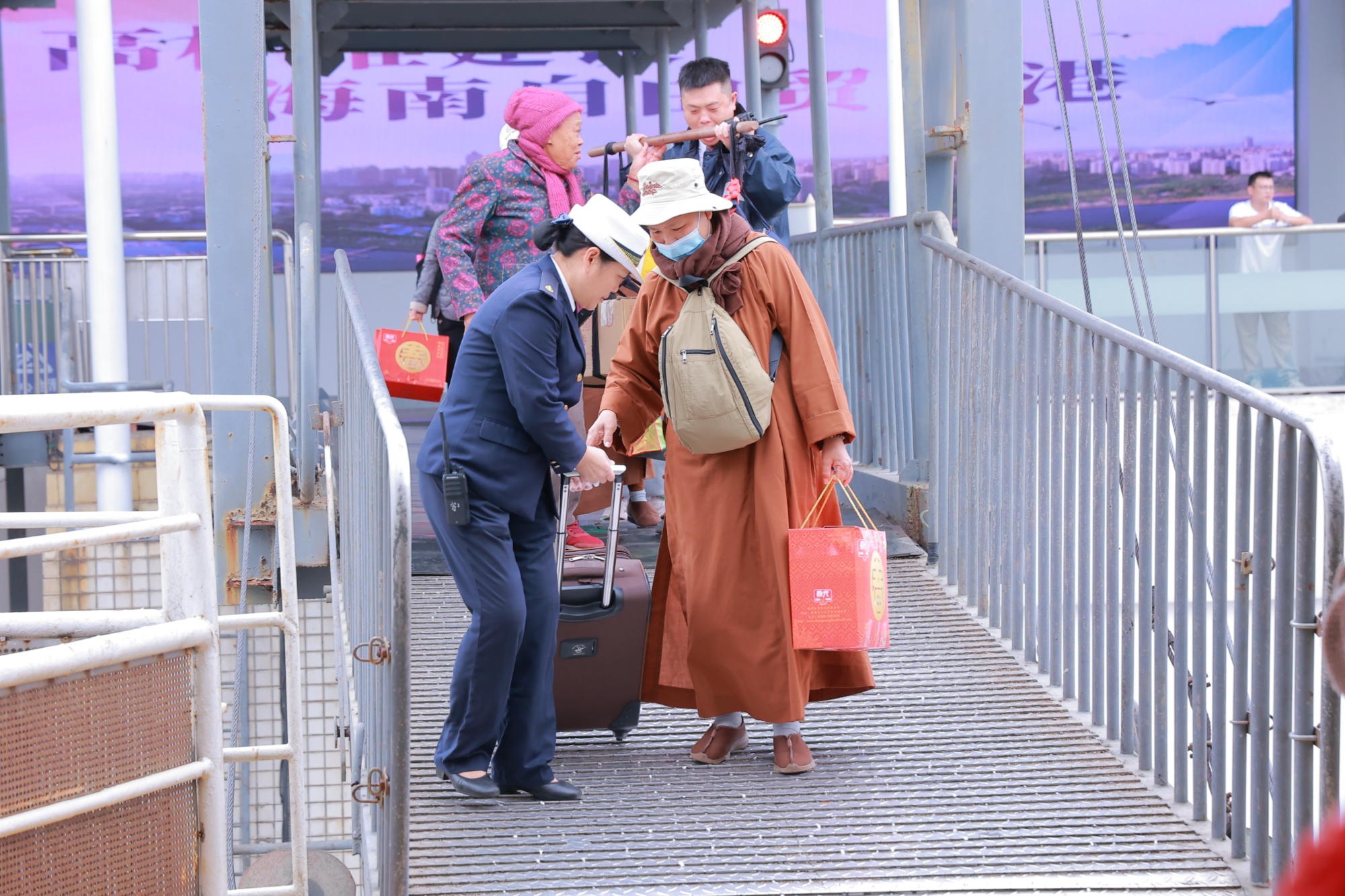 港口工作人員幫助旅客搬運(yùn)行李(央廣網(wǎng)發(fā) 李必政 攝)