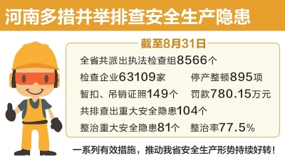 我省各地及有關(guān)部門堅(jiān)持大檢查與嚴(yán)執(zhí)法相結(jié)合,加大隱患排查治理力度,依法嚴(yán)厲打擊各類違法違規(guī)行為,徹底整治了一批重大事故隱患。截至8月31日,全省共派出執(zhí)法檢查組8566個,檢查企業(yè)63109家,停產(chǎn)整頓895項(xiàng),暫扣、吊銷證照149個,罰款780.15萬元;共排查出重大安全隱患104個,已整治81個,整治率77.5%。