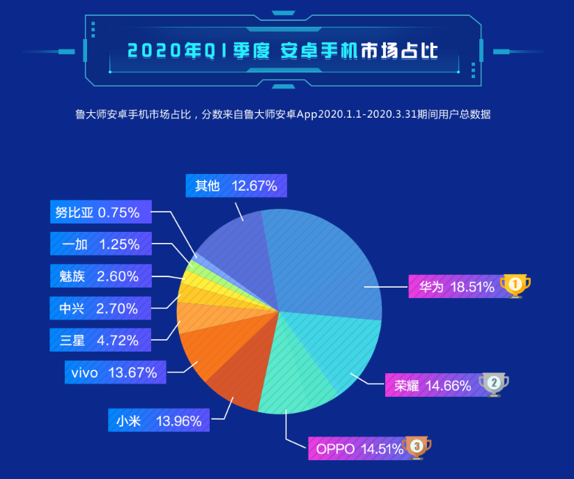 在這種“逆境下”,華為、榮耀的市場(chǎng)份額依舊保持著遙遙領(lǐng)先的姿態(tài)。根據(jù)魯大師2020年Q1季度安卓新增市場(chǎng)占比來(lái)看,華為、榮耀兩者加起來(lái)就占據(jù)了Q1市場(chǎng)33.17的份額,甩開(kāi)了其他國(guó)產(chǎn)品牌一大截,實(shí)現(xiàn)了逆勢(shì)增長(zhǎng)。