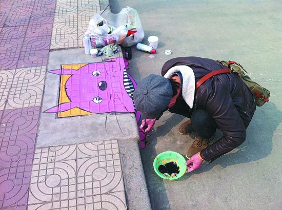 央廣網(wǎng)河南分網(wǎng)消息 據(jù)燕趙都市報報道:河北經(jīng)貿(mào)大學(xué)的校園里最近多了一道風(fēng)景:井蓋、下水道、臺階上,出現(xiàn)了小豬、大黃鴨、大臉貓、加菲貓小動物,這些畫都出自河北經(jīng)貿(mào)大學(xué)大四學(xué)生熊航之手。熊航說,如果可以的話,他想把這種井蓋藝術(shù)帶到城市里。 (記者 劉濤 李保健/攝)