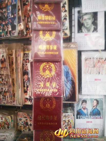 隨后,記者來到內(nèi)江市中區(qū)上南街、工商街等中小學(xué)校外面看到,有些文具店不僅賣的有本子、筆等學(xué)習(xí)用具,還有五顏六色的“處女證”、“流氓證”、“泡妞證”等,以及“欠揍”“求包養(yǎng)”等語言粗俗的牌子。這些證書和牌子的封面制作得很精致。