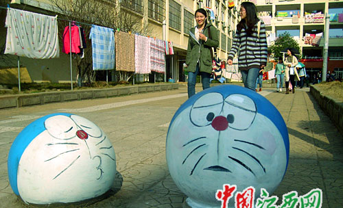 南昌大學(xué)校園里偶遇機(jī)器貓 原是學(xué)生創(chuàng)意涂鴉