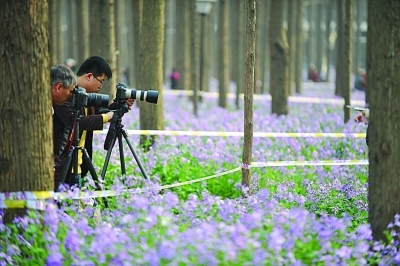 記者了解到,從去年開始學校就成立了“護花”小隊,勸告游人文明賞花。而昨日記者來到南理工時發(fā)現(xiàn),原來全部開放的樹林中拉起了一條條黃色的警戒線。一位保安告訴記者,因為去年管理的效果不理想,所以今年開始用這種警戒線將游人和花叢隔離開來。不過記者在現(xiàn)場看到,還是有不少市民會跑進花叢中拍照,地面上能看出明顯被踩踏破壞的區(qū)域就有好幾處。
