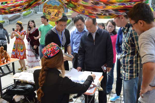 參觀中,校黨委書記張中華認(rèn)真聽、看和詢問各民族所展示的動(dòng)人神話傳說、珍藏典籍、特色民族服飾、民族文字和繪畫作品,品嘗各民族特色傳統(tǒng)美食。當(dāng)他走到哈薩克族的展示區(qū)時(shí),哈族的一對(duì)姑娘、小伙兒正在現(xiàn)場模擬民族結(jié)婚嫁娶習(xí)俗,一對(duì)“新人”盛情邀請(qǐng)他做“主婚人”,親身體驗(yàn)和感受民族婚嫁文化。