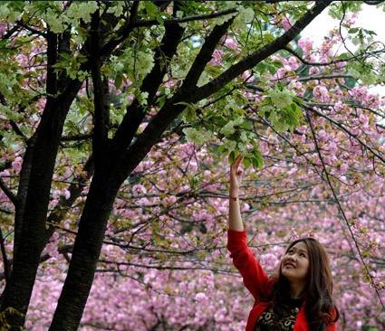 校園綠櫻花開(kāi)放 萬(wàn)紅叢中一樹(shù)綠