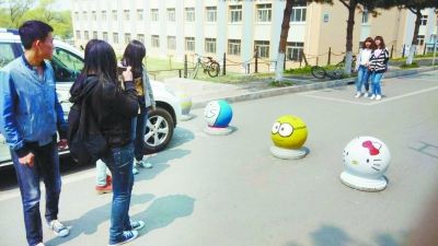 昨日,記者來到吉林農(nóng)大,在經(jīng)過一番打聽和尋找之后,在該校一座食堂樓前找到了這幾個可愛的路障。記者看到,食堂門前的這條路兩側(cè)各有5個圓球形的路障,靠近食堂的這5個路障中,有3個被人涂鴉。不僅有哆啦A夢、小黃人,還有女生們喜歡的Hello Kitty。由于正值午飯時間,校園里往來于食堂的學生們路過此處都會駐足看上兩眼,“太有才了,好像大頭娃娃,太可愛了。”議論之余,一些學生還掏出了手機拍照留念。