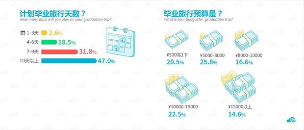 不同于80后,95后學(xué)生群體更注重旅行體驗,在旅行開銷上面花費更多預(yù)算。調(diào)查結(jié)果顯示,超過78% 的學(xué)生將畢業(yè)旅行規(guī)劃為7-10天的長線旅行,愿意花更多的時間去體驗旅行,而不是走馬觀花看景點。其中37.1%的同學(xué)將畢業(yè)旅行的預(yù)算設(shè)為10000元以上;美食、購物、藝術(shù)展等深度體驗項目成為95后旅行消費中的重點。