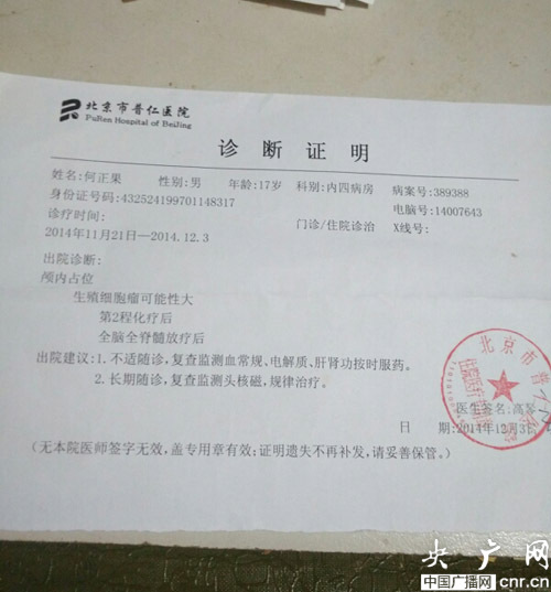 據(jù)何文介紹,何正果患有生殖細胞瘤和尿崩癥,在北京做過化療后,和自己一塊乘坐k471次列車從北京返回新化,4日早上途徑信陽時,何文剛好睡著了約20分鐘,期間何正果獨自下車并離開車站,何文便從武昌下車返回信陽尋找。