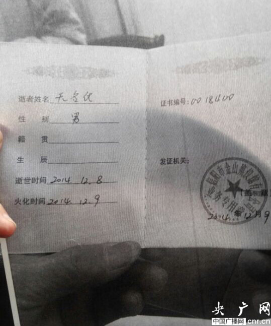 而火化證明上顯示:“逝者姓名為無名氏,逝世時間是12月8日,9日火化!焙挝恼f,自己到殯儀館去拿骨灰盒的時候,工作人員剛開始給自己開了一個58號,隨后對方讓自己稍等一下,等了約20分鐘后卻給了自己一個61號,當何文要求文字根據(jù)的時候,對方直接給自己開了一個火化證明。