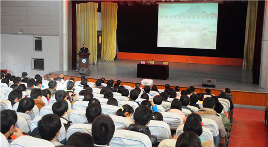 經(jīng)焦作市博物館邀請,由河南博物院副書記、研究館員丁福利先生主講的“中國歷史文化的源頭與主流”主題講座在河南理工大學(xué)小禮堂舉行。整個活動由能源科學(xué)與工程學(xué)院副書記楊可臣主持,分為講座與互動問答兩部分,勾攀峰院長等學(xué)院領(lǐng)導(dǎo)以及焦作市博物館館長郭繼賓到場聽講。主講學(xué)者從中華民族文化歷史淵源、中原文明在中華文明歷史上的作用、中原文化之亮點(diǎn)、中原經(jīng)濟(jì)區(qū)建立的重要性等方面做了概括闡述。大學(xué)生們思維活躍,觀點(diǎn)鮮明,提出了如何復(fù)興中華文化,河南的典型文化符號有哪些,怎樣看待“國學(xué)消亡”說,英語與漢語的地位如何平衡等尖銳問題,學(xué)者均認(rèn)真作答,并鄭重承諾,未盡事宜將以信件形式回復(fù)校方轉(zhuǎn)告同學(xué)們,F(xiàn)場氣氛十分熱烈。最后,講座在“華夏古樂”的悠揚(yáng)琴音中圓滿結(jié)束。