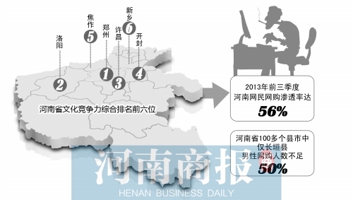 而據(jù)中原文化研究所助理研究員郭海蓉介紹,2013年前三季度,河南網(wǎng)民網(wǎng)購滲透率達(dá)56%,高于全國(guó)平均水平10.1個(gè)百分點(diǎn)。